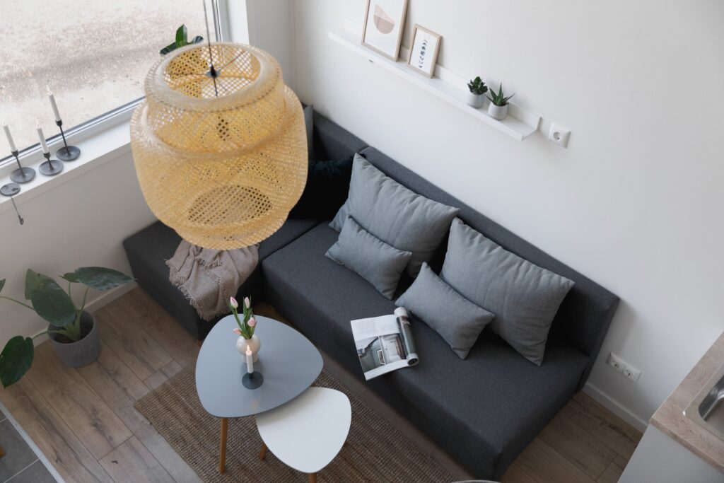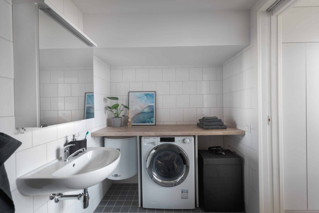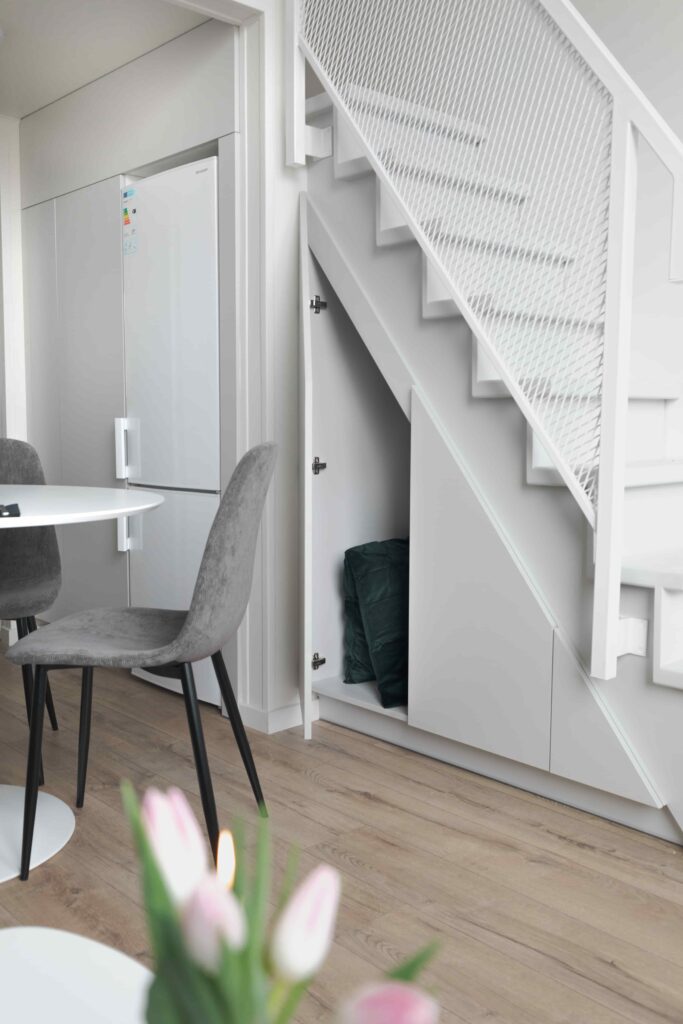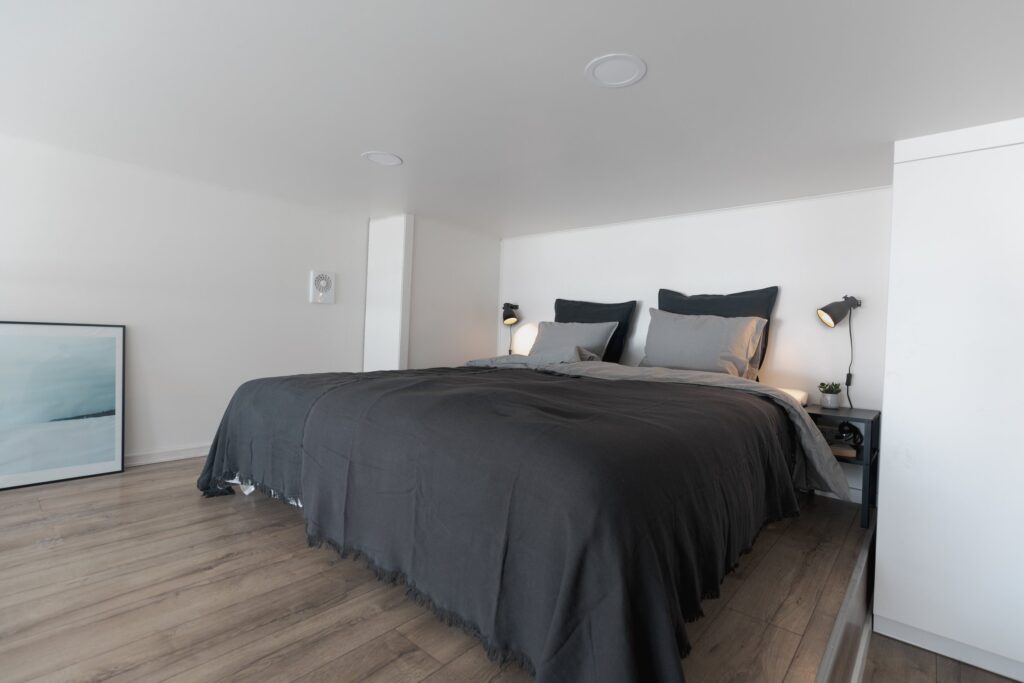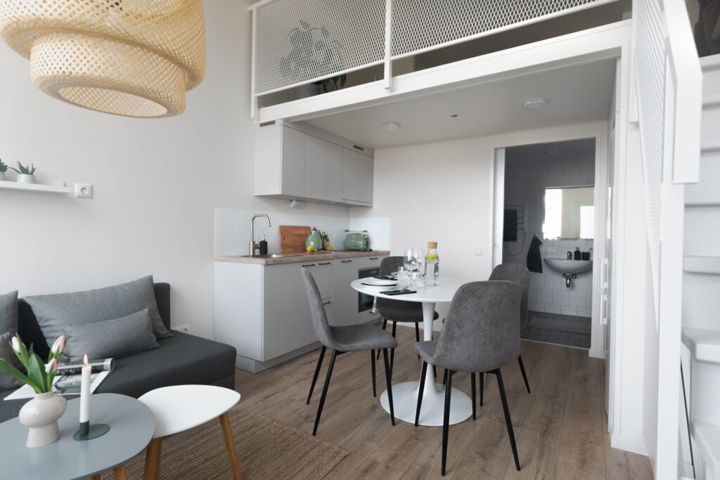 The Danske Boliger studio has a minimalist interior with a Scandinavian aesthetic. It offers modern amenities in a calm and functional environment.